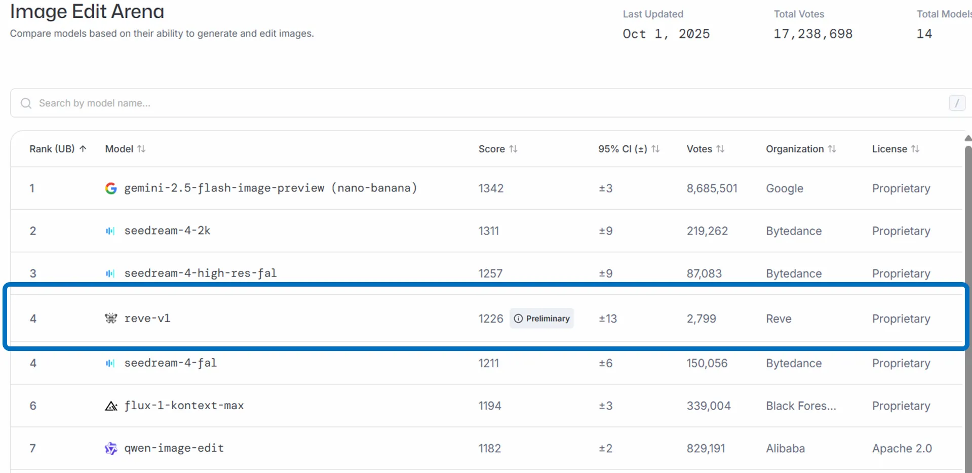 | Reve v1 | Editing model tuned for single/multi-image jobs; sits near the top of edit leaderboards. |