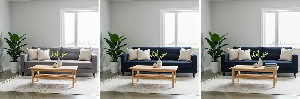 Prompt 2 (editing): Change the sofa color to dark navy blue.
