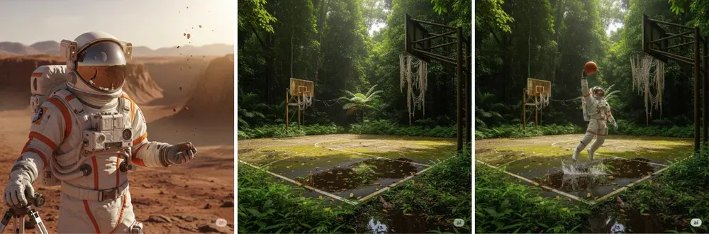 Prompt 3 (upload both and compose): Depict the astronaut dunking a basketball on this court.
