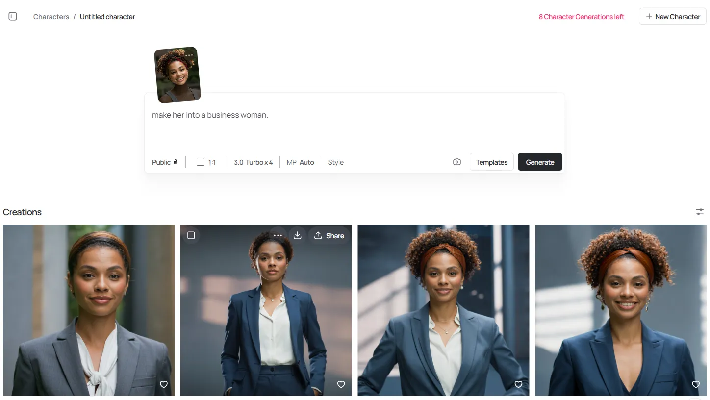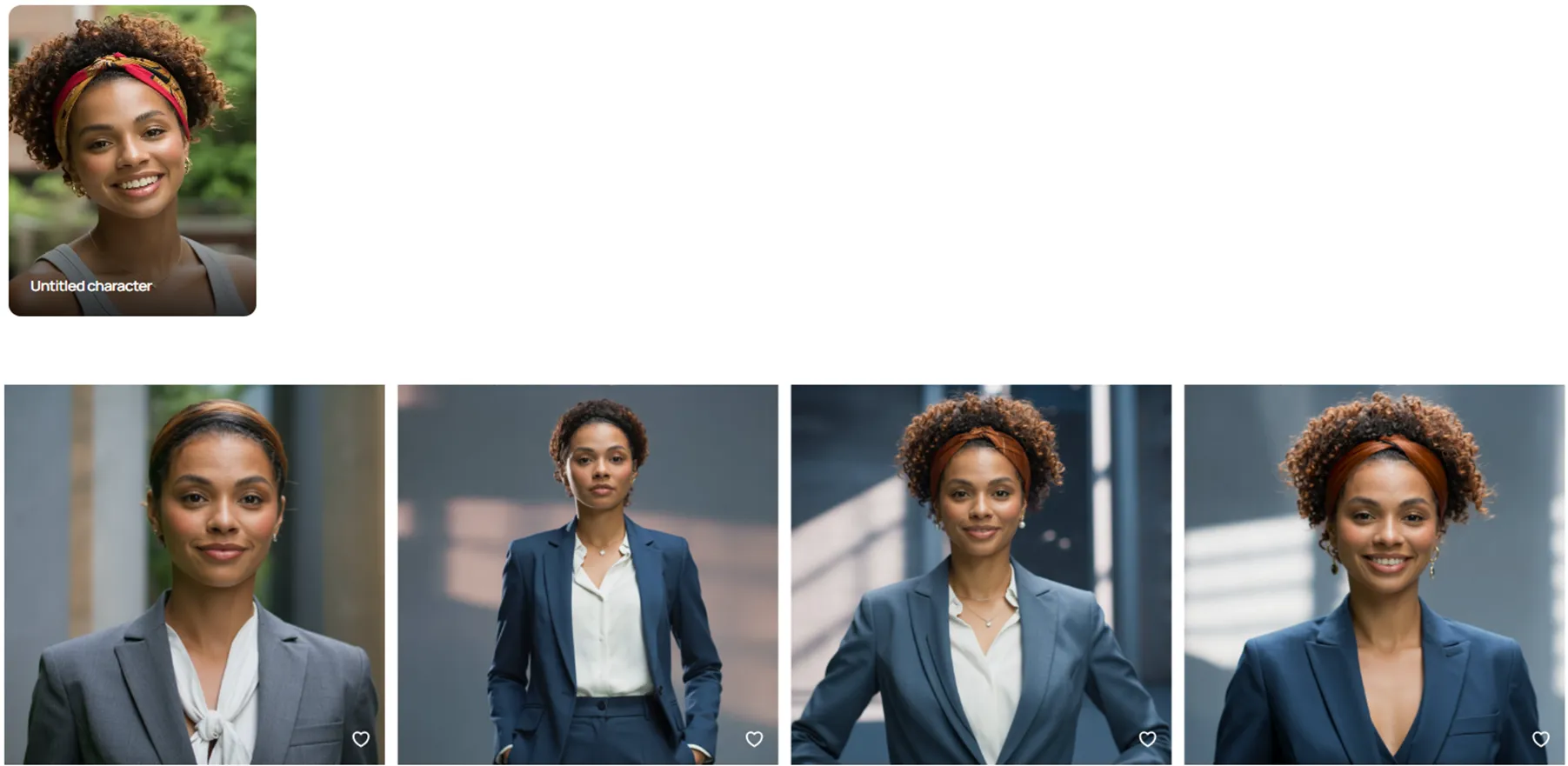 For example, using the sample image below, we generated four character images with the prompt “make her into a business woman.”