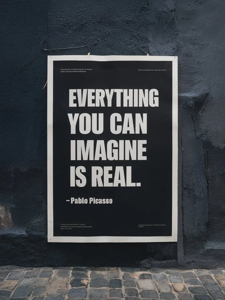 A poster on a wall with text that reads: "Everything you can imagine is real. – Pablo Picasso"