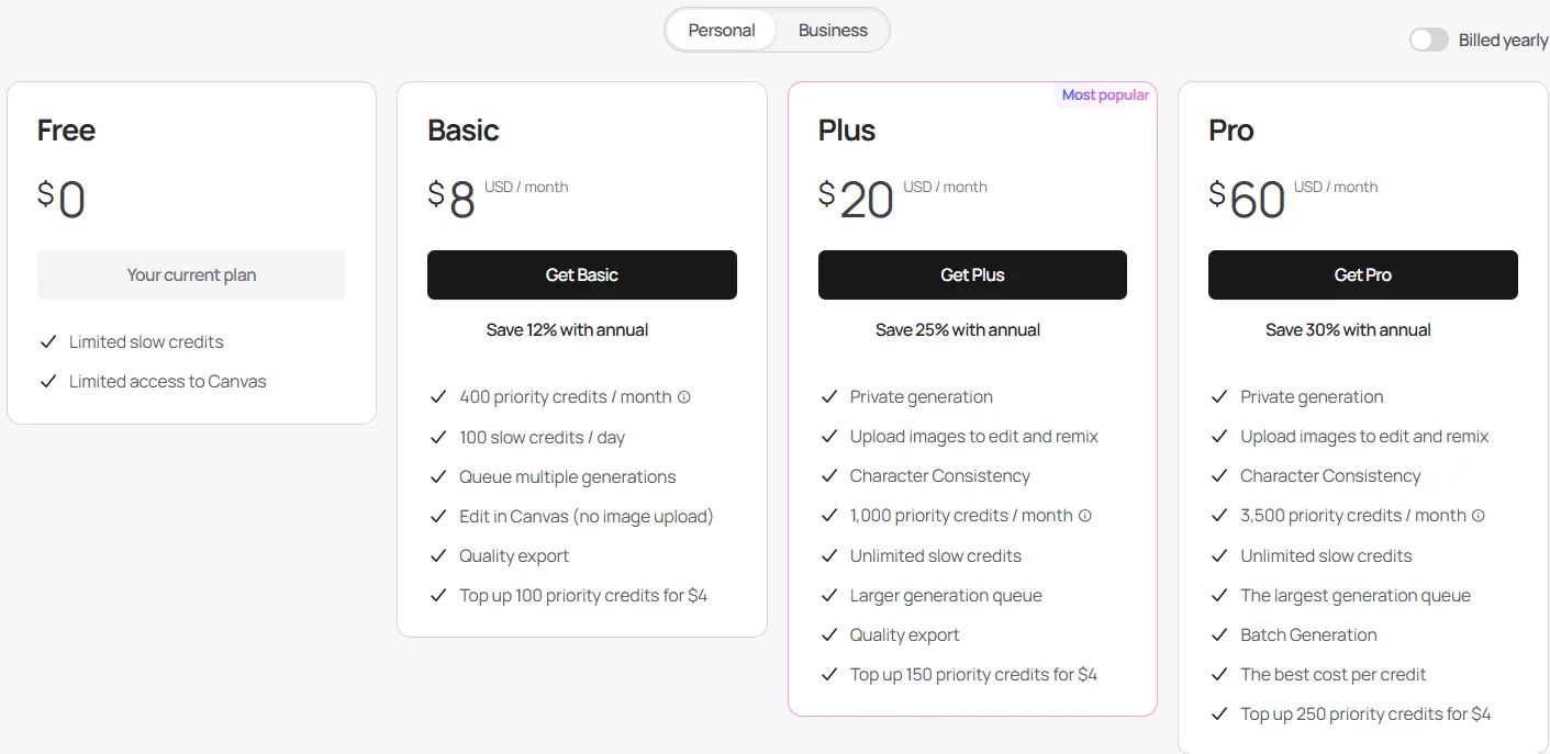 | Basic | $8 | 100 credits per day + 400 priority credits per month | Negative prompts, seed locking |
