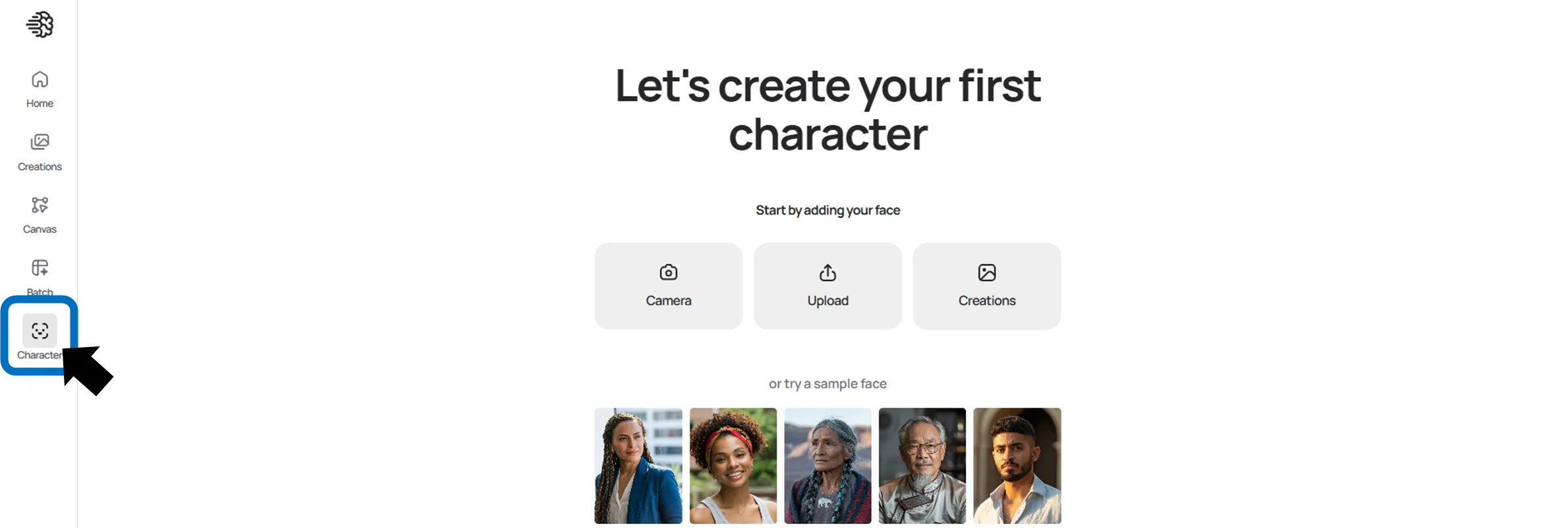 First, open the Character tab on the generation screen. Upload or capture a reference image and set it, then the character will be linked to the prompt input field.