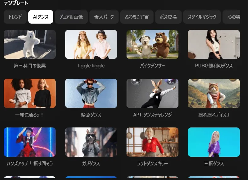 Includes many one-click video templates trending on social media, such as “AI Kiss,” “AI Hug,” and “AI Muscle.”