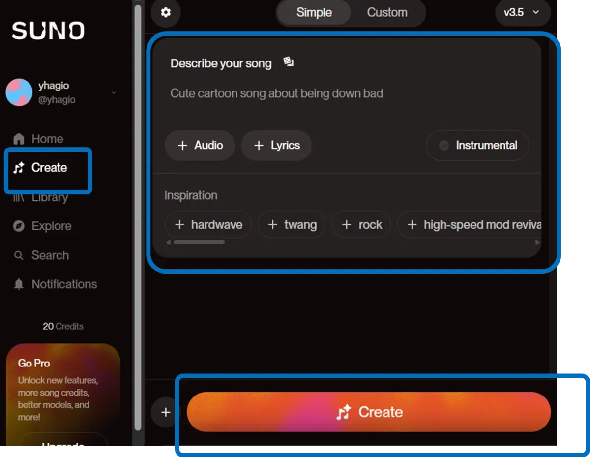 After logging in, click the “Create” menu. Enter the image of the music you want to generate in the input area. If you want to specify detailed settings such as lyrics, tempo, and key, use Custom mode. After entering, click “Create.”